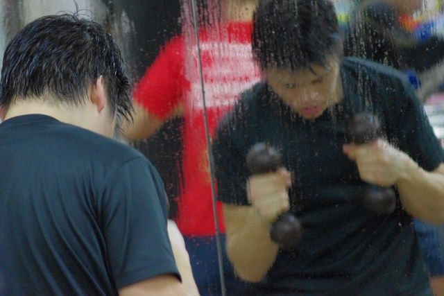 ジム内は汗と湿気で床がベタベタになってたんですが、コヨーテさんがそんな汗まみれの床に顔をギリギリまで近づける気合いの入った腕立て伏せをしたはりました。笑