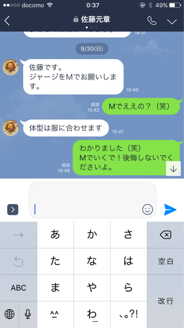どう考えてもLサイズやろ!って突っ込み、何度となく、Lにしときなさいよ!って連絡してあげたんですが、かたくなにMサイズを頼んだS藤くん。